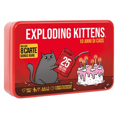 Prezzo consigliato al pubblico 22,99Tipologia di gioco Gioco baseTarget Cliente ExpertEtà 7 YEARSNumero di Giocatori 2 to 5Durata 15 minStudio Exploding KittensLingua ItalianoDATA DI USCITA: 20 FEBBRAIO 2026.Un’edizione speciale per celebrare il decimo anniversario di: Exploding Kittens!Come?Con lo stesso gioco che vi ha fatto innamorare, in una più elegante e resistente scatola in latta e ben 8 carte bonus rare, introdotte in espansioni passate ma ormai fuori catalogo. Queste carte vengono ora reintrodotte con maggiori specifiche, anche a simboleggiare l’evoluzione del titolo negli anni.Contenuto: 56 carte, 8 carte bonus, 1 regolamento.Imballo: 1 pezzo.