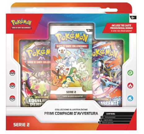 URGENTE: Preordini entro: 17/04/2026* Disponibilità: 19 giugno 2026 *circaDescrizione: La collezione illustrazione Primi compagni d'avventura - Serie 2 del GCC Pokémon contiene:• Una busta di espansione del GCC Pokémon con tre delle possibili nove carte promozionali• Due buste di espansione del GCC Pokémon • Un foglio di adesivi