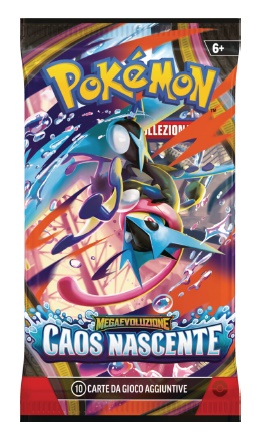 Deadline ordini: 09 aprile Lingua: Italiano* Disponibilità: 22 maggio 2026 *circaDescrizione: L'espansione Megaevoluzione - Caos Nascente del GCC Pokémon contiene oltre 120 carte. Ogni busta dell'espansione Megaevoluzione - Caos Nascente del GCC Pokémon contiene 10 carte, un Energia base e una carta codice per il GCC Pokémon Live.
